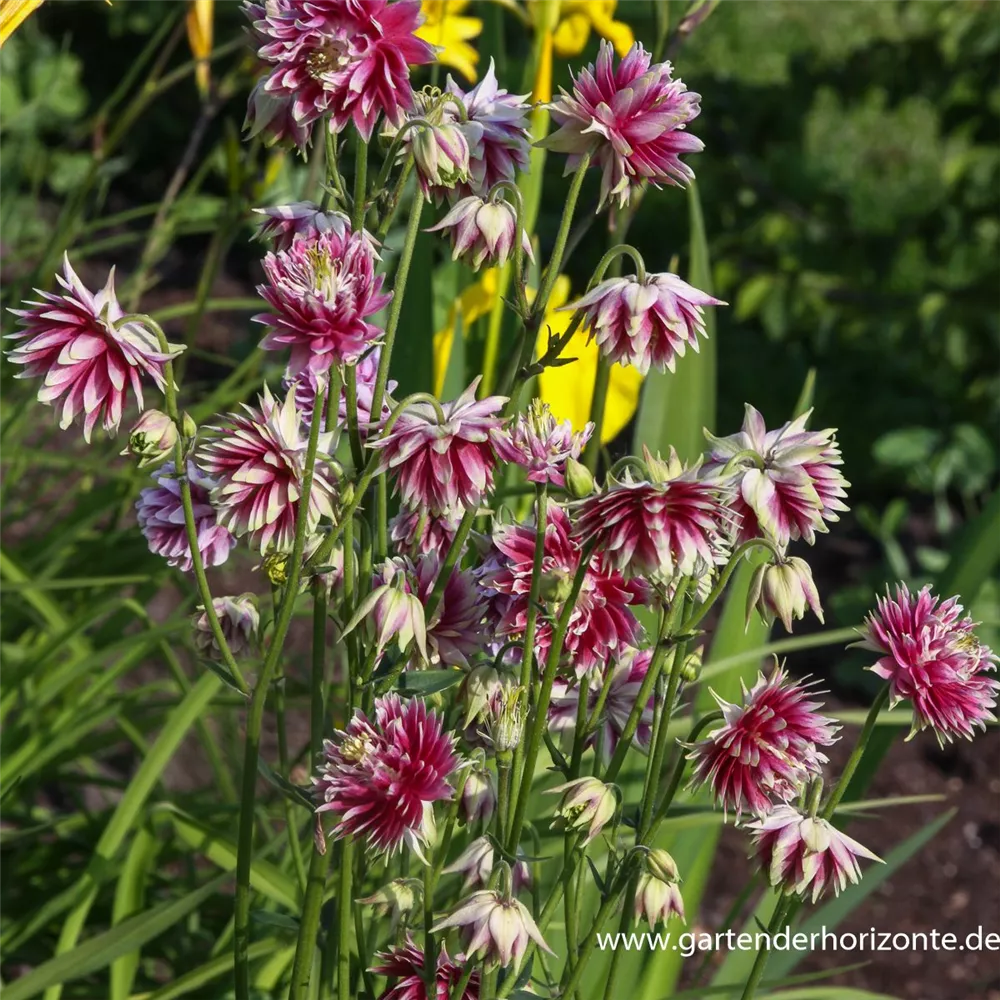 Aquilegia vulgaris 'Nora Barlow' bildet gefüllte, glockenförmige, zweifarbige Blüten ab Mai.