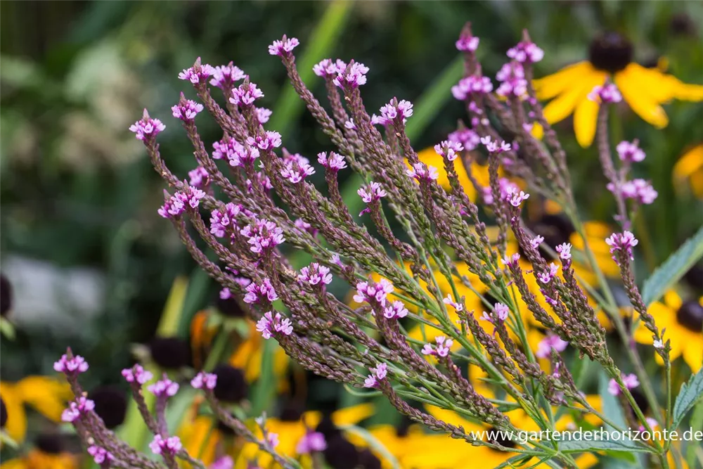 Verbena hastata 'Pink Spires' bildet in Ähren angeordnete, rosafarbene Blüten ab Juni.