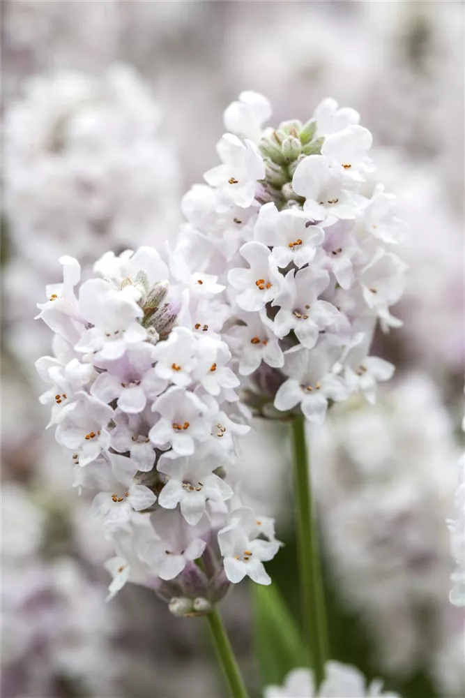 Der Echte Lavendel 'Ellagance Ice' (Lavandula angustifolia) ist eine buschige immergrüne Staude, die von Juli bis September weiße, rachenförmige, in Rispen angeordnete Blüten mit einem angenehmen Duft bildet. An einem sonnigen Standort mit durchlässigem, nährstoffreichem Boden erreicht er gewöhnlich eine Höhe von ca. 50 cm und wird ca. 30 cm breit. Der Echte Lavendel 'Ellagance Ice' ist gut frostverträglich.