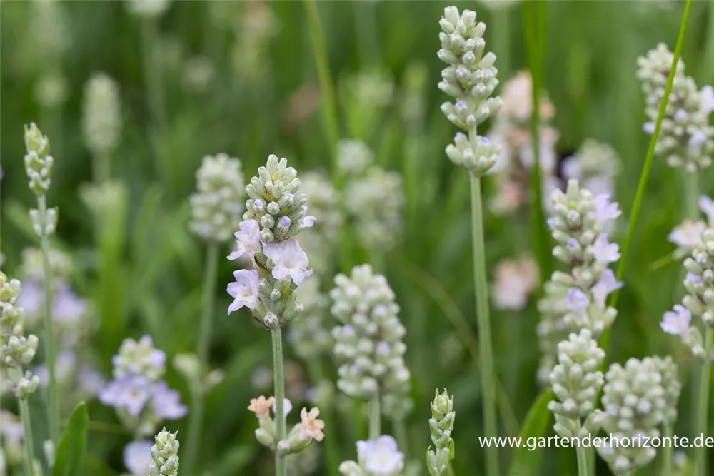 Lavandula angustifolia 'Ellagance Ice' bildet rachenförmige, in Rispen angeordnete, weiße Blüten ab Juli. Diese verströmen einen angenehmen Duft.