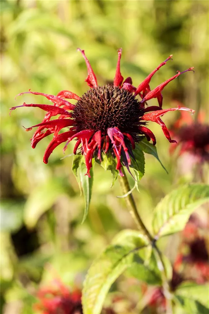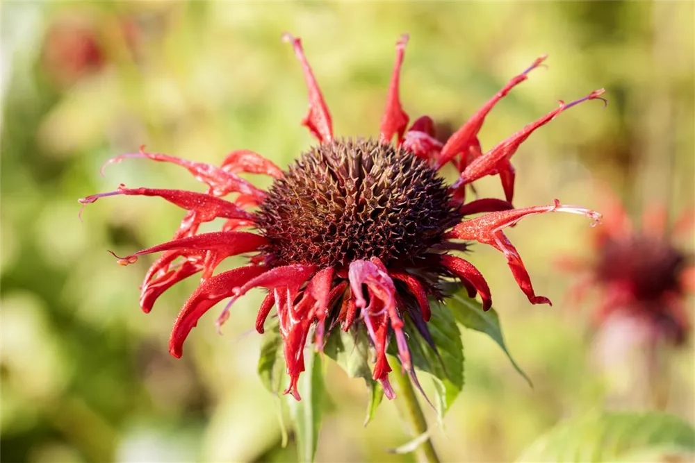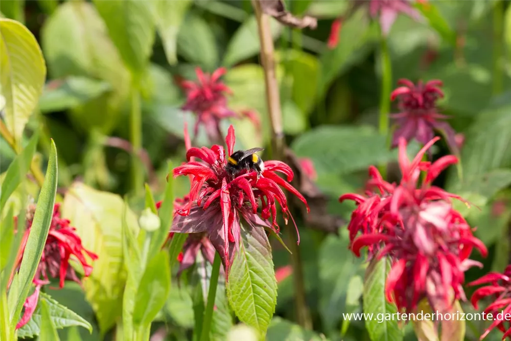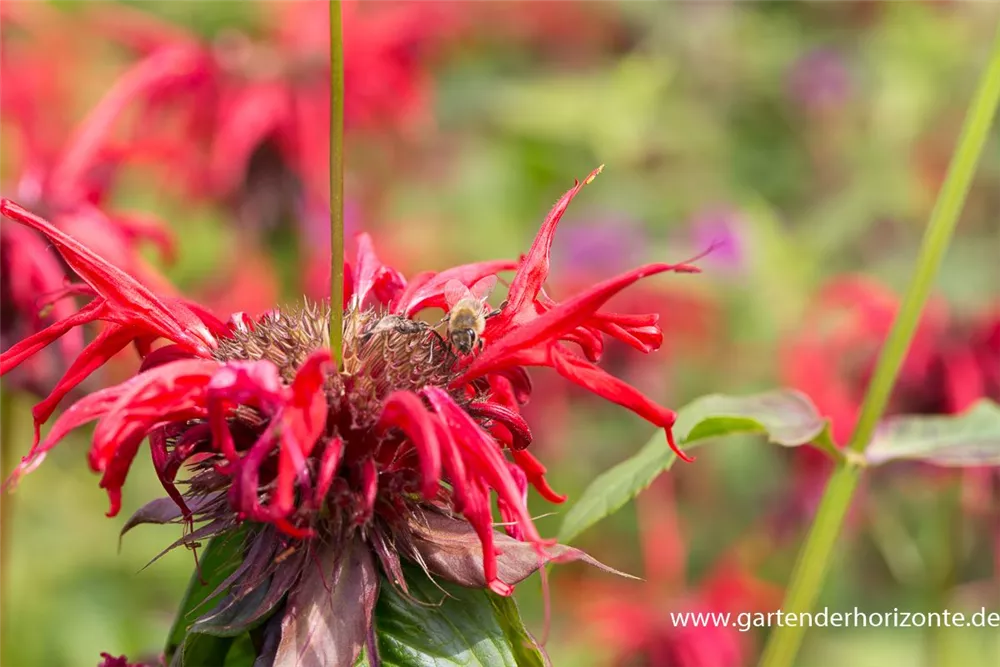 Monarda didyma 'Squaw' bildet scharlachrote Blüten ab Juni.