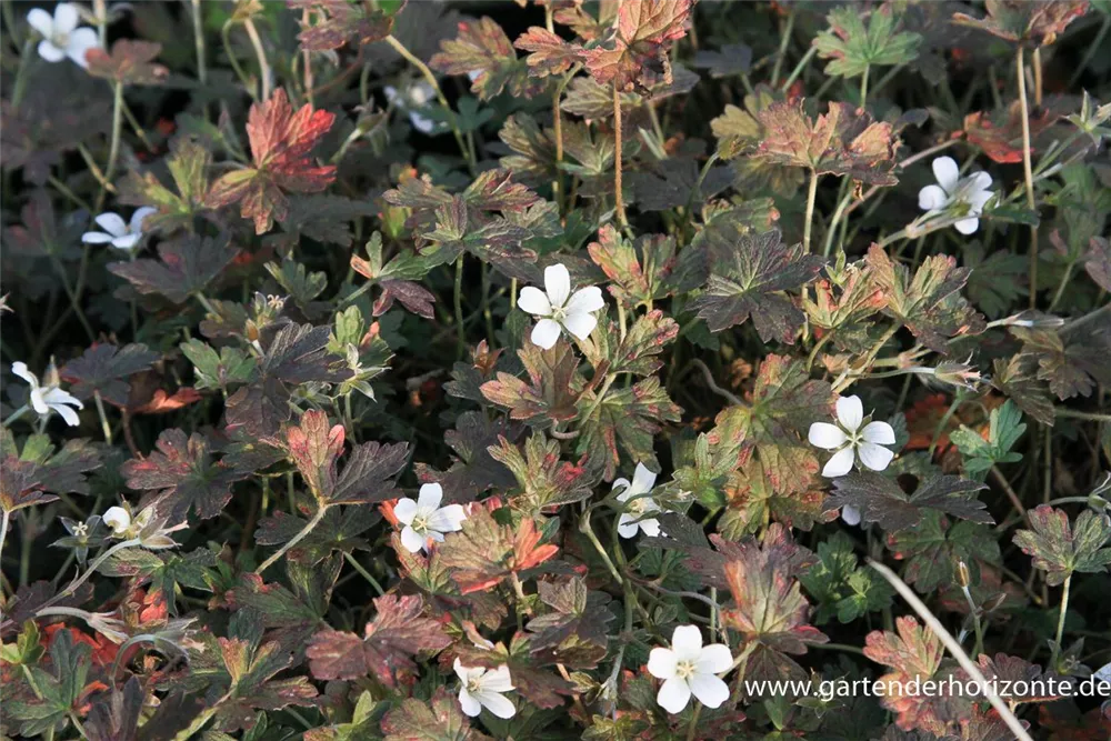 Geranium sessiliflorum 'Sanne' bildet schalenförmige, weiße Blüten ab Mai.