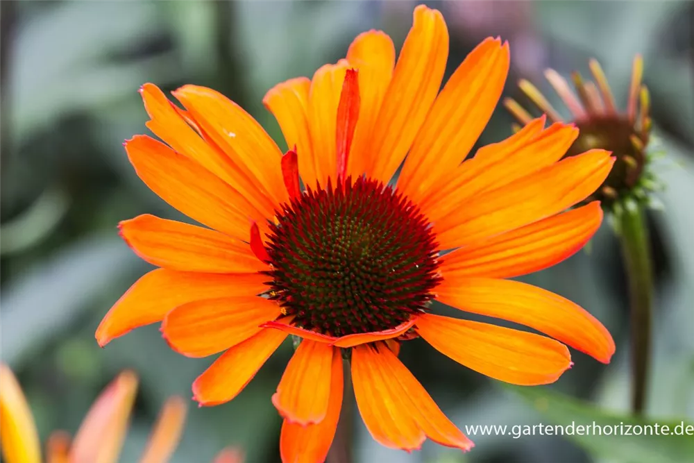 Der Oranger Sonnenhut (Echinacea purpurea) ist eine aufrechte Staude, die von Juli bis September leuchtend orangegelbe, körbchenartige Blüten bildet. An einem sonnigen Standort mit durchlässigem, humosem Boden erreicht er gewöhnlich eine Höhe von ca. 80 cm. Der Oranger Sonnenhut ist gut frostverträglich.