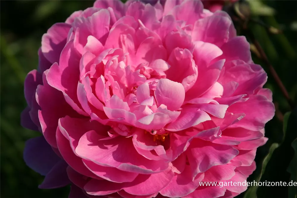Paeonia lactiflora 'Gilbert Barthelot' bildet gefüllte, schalenförmige, dunkelrosafarbene Blüten ab Mai. Diese verströmen einen angenehmen Duft und werden etwa 10 - 12 cm groß.