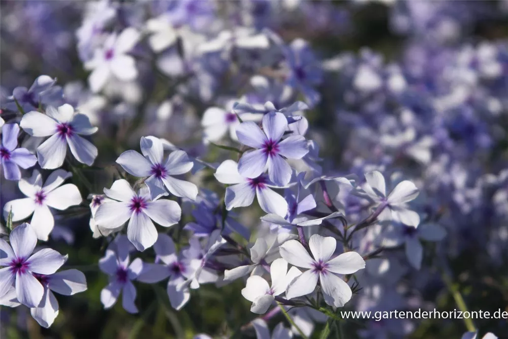 Phlox divaricata 'Chattahoochee' bildet radförmige, in Trugdolden angeordnete, lila-weiße Blüten ab Mai. Diese verströmen einen starken Duft.