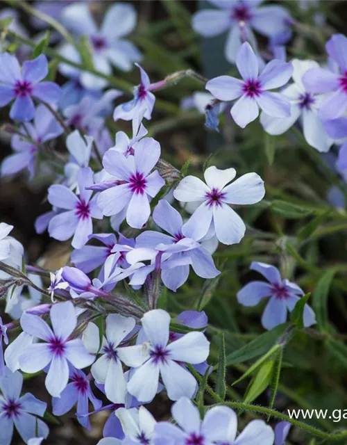 Die Garten-Flammenblume 'Chattahoochee' (Phlox divaricata) ist eine kriechende wintergrüne Staude, die von Mai bis Juni lila-weiße, radförmige, in Trugdolden angeordnete Blüten mit einem starken Duft bildet. An einem halbschattigen Standort mit durchlässigem, kalkfreiem Boden erreicht sie gewöhnlich eine Höhe von ca. 20 cm und wird ca. 25 cm breit. Die Garten-Flammenblume 'Chattahoochee' ist gut frostverträglich.