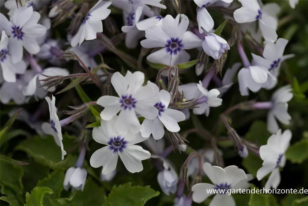 Phlox subulata 'Bavaria' bildet in Dolden angeordnete, blau-weiße Blüten ab April.