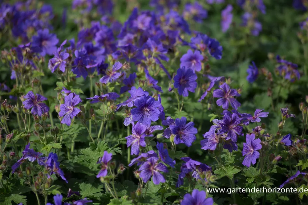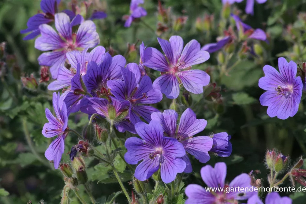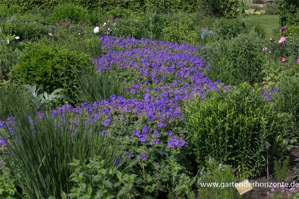 Geranium x magnificum 'Rosemoor' bildet schalenförmige, blauviolette Blüten ab Mai.