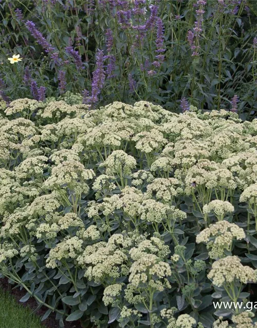 Sedum spectabile 'Sunkissed'® bildet in Dolden angeordnete, hellgelbe Blüten ab August.