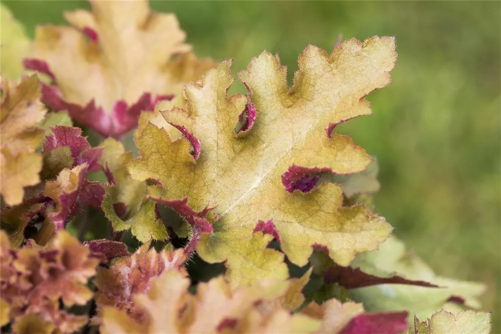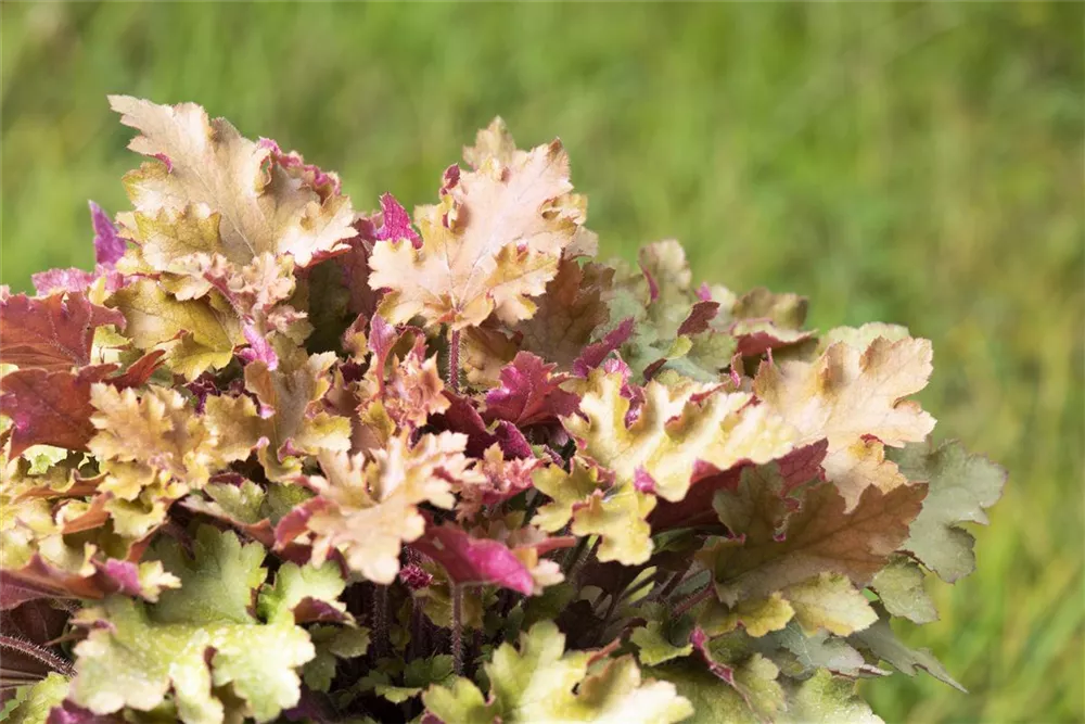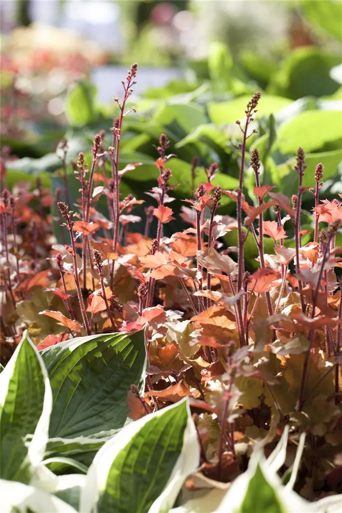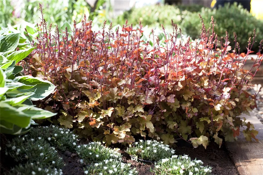 Das Purpurglöckchen 'Marmalade'(s) (Heuchera) ist eine buschige wintergrüne Staude mit dekorativen, kupferbraunen Blättern. An einem sonnigen bis halbschattigen Standort mit durchlässigem, nährstoffreichem Boden erreicht es gewöhnlich eine Höhe von ca. 50 cm und wird ca. 40 cm breit. Das Purpurglöckchen 'Marmalade'(s) ist gut frostverträglich.
