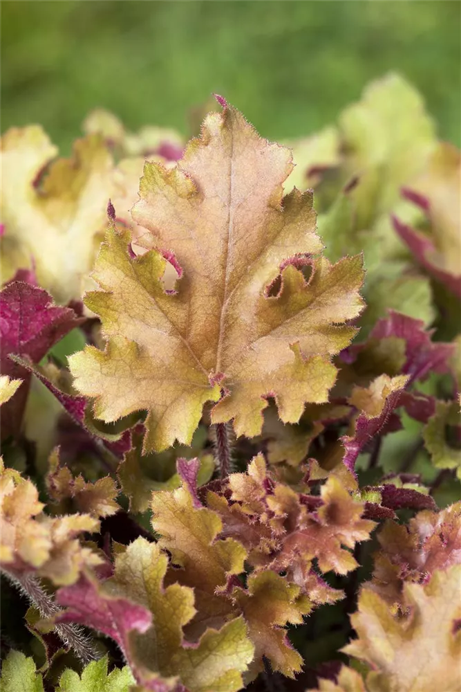 Hoher Blattschmuckwert. Die wintergrünen Blätter des Purpurglöckchens 'Marmalade'(s) sind kupferbraun.