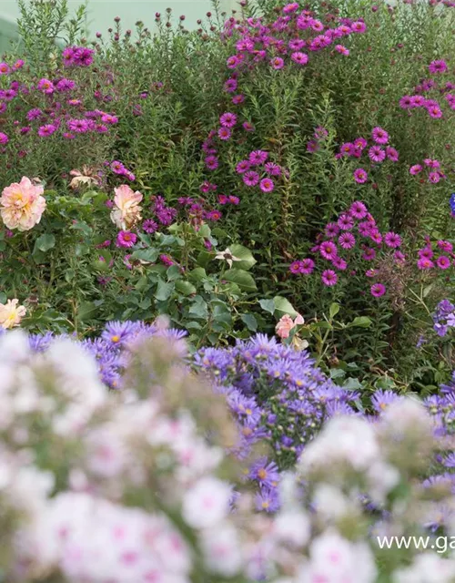 Die Garten-Raublatt-Aster 'Andenken an Paul Gerber' setzt schöne Akzente gemeinsam mit: