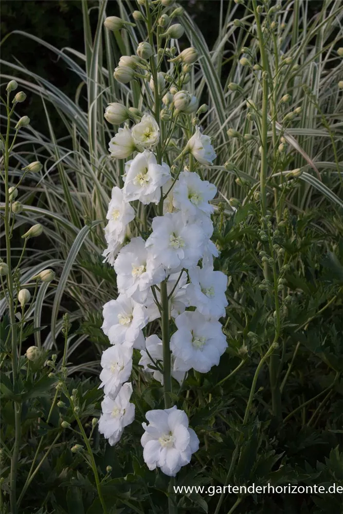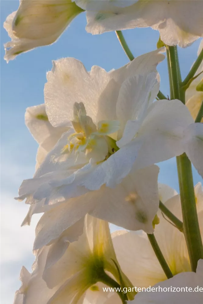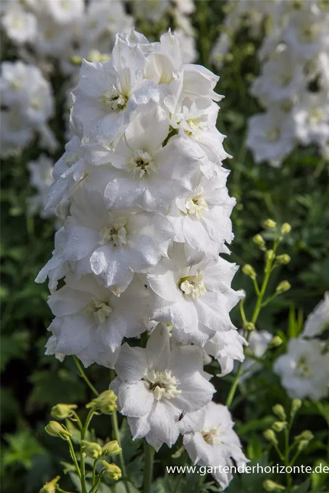Delphinium x cultorum 'Diamant' bildet gefüllte, trichterförmige, weiße Blüten ab Juni. Bei richtiger Pflege Nachblüte von September bis Oktober.
