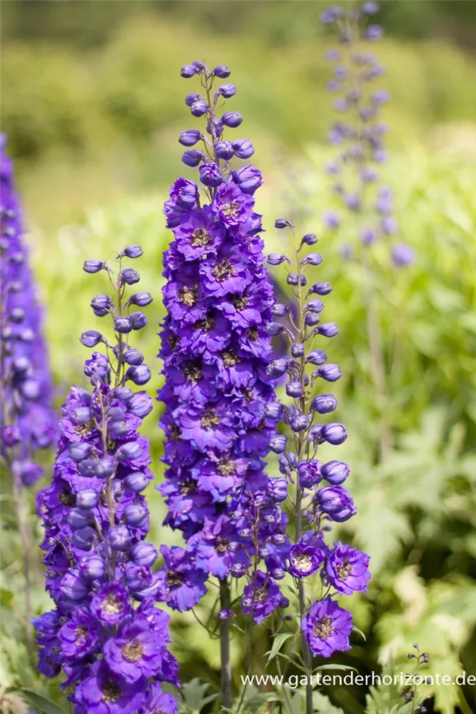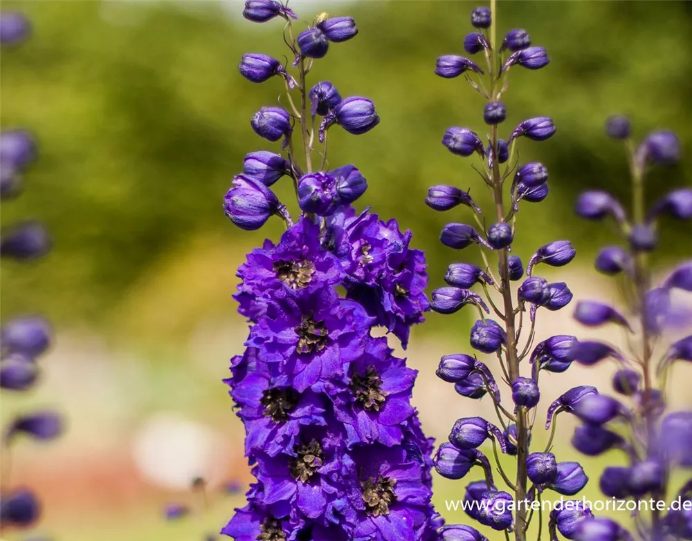 Delphinium x cultorum 'Secret' bildet halbgefüllte, trichterförmige, blauviolette Blüten ab Juni. Bei richtiger Pflege Nachblüte von September bis Oktober.