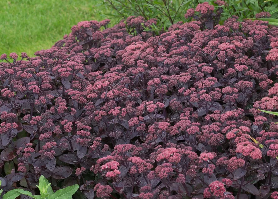 Sedum telephium 'Xenox'® bildet in Dolden angeordnete, dunkelrosafarbene Blüten ab September.