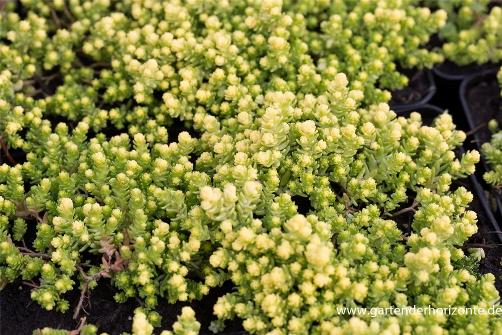 Die Fetthenne (Sedum rubrotinctum) ist eine aufrechte Staude, die, je nach Sorte, Blüten in verschiedenen Farben bildet. An einem sonnigen Standort mit durchlässigem, nährstoffreichem Boden erreicht sie gewöhnlich eine Höhe von ca. 30 cm und wird ca. 30 cm breit.
