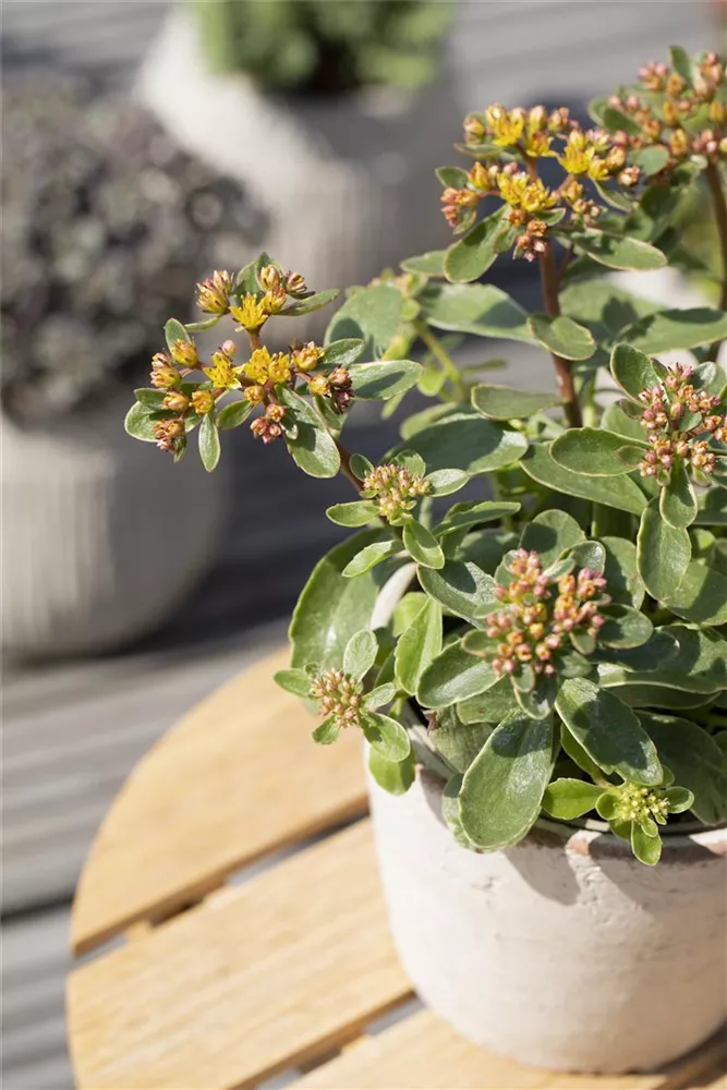 Sedum kamtschaticum 'Variegatum' bildet sternförmige, in Dolden angeordnete, gelbbunte Blüten ab Juli.