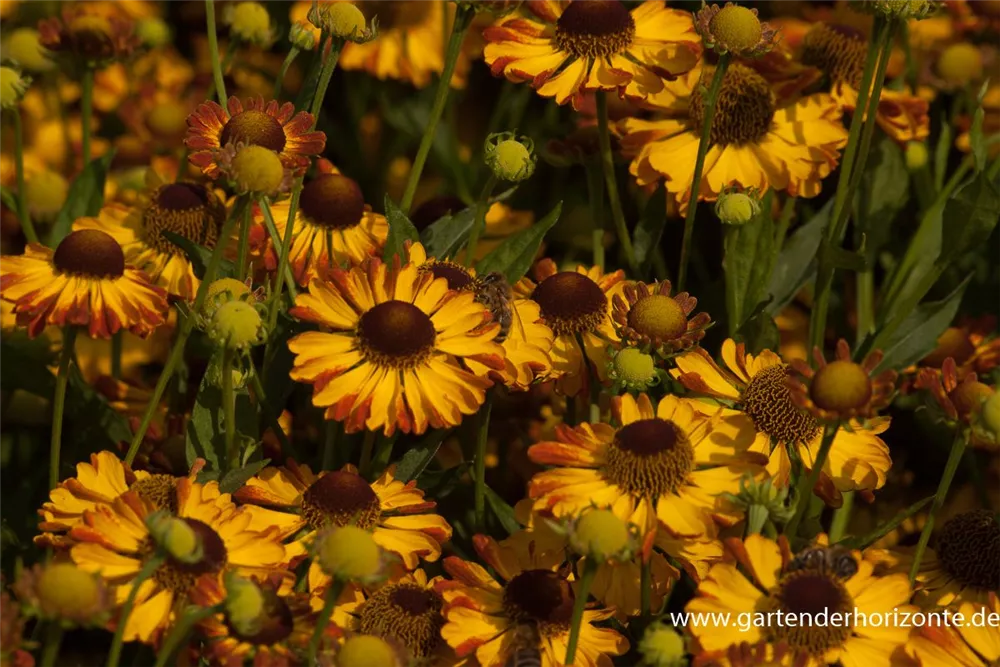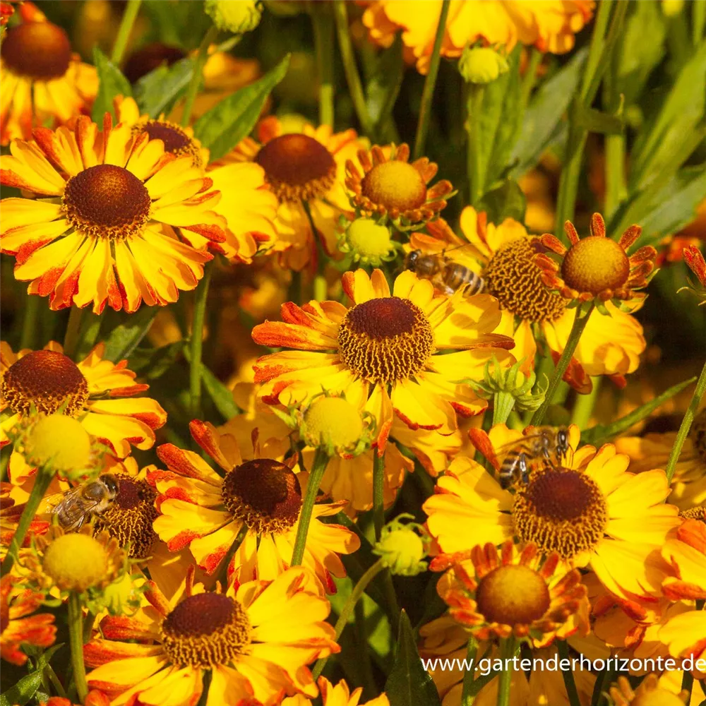 Die Garten-Sonnenbraut 'Sonnenkringel' (Helenium) ist eine aufrechte Staude, die von Juli bis September gelbe, körbchenartige Blüten bildet. An einem sonnigen Standort mit durchlässigem, nährstoffreichem Boden erreicht sie gewöhnlich eine Höhe von ca. 1,4 m und wird ca. 60 cm breit. Die Garten-Sonnenbraut 'Sonnenkringel' ist gut frostverträglich.