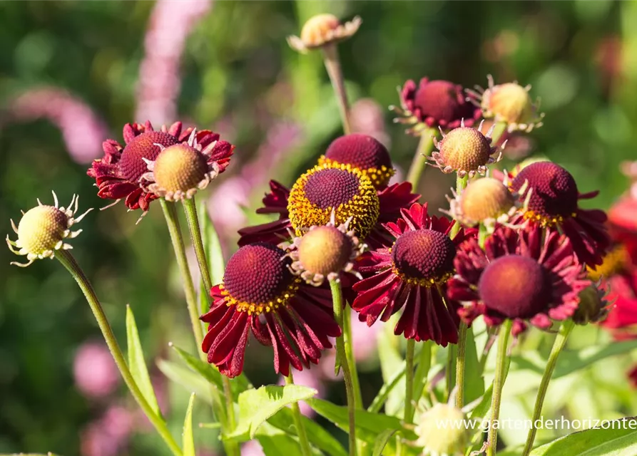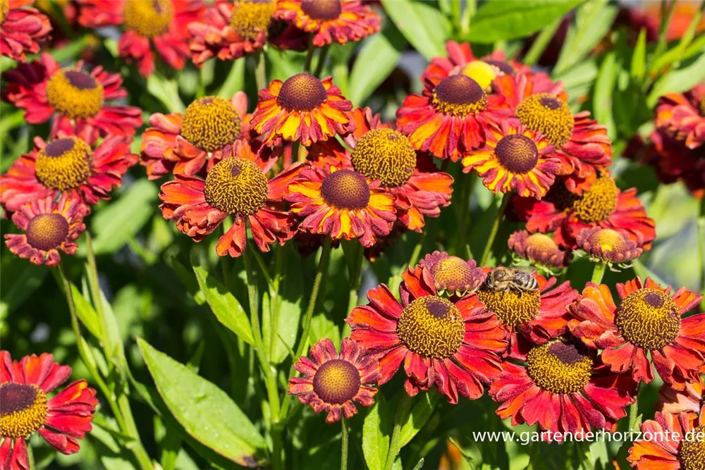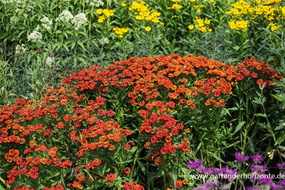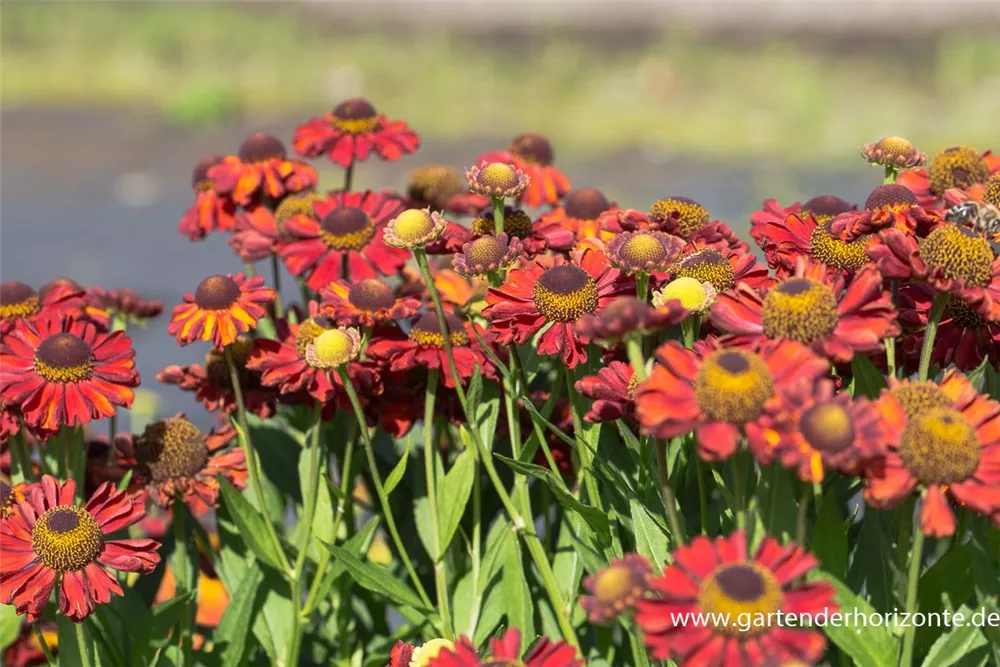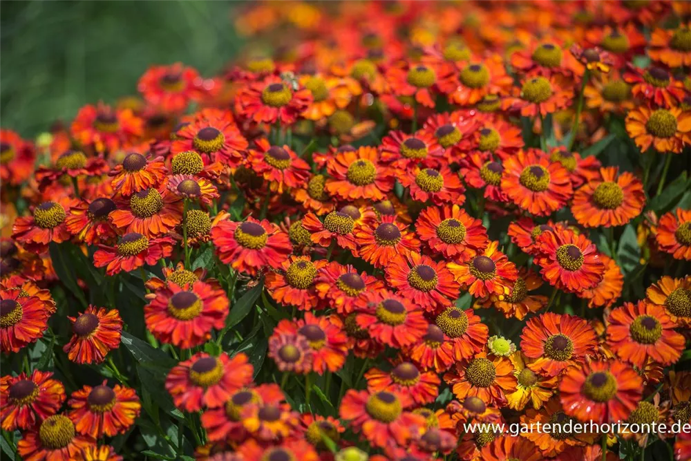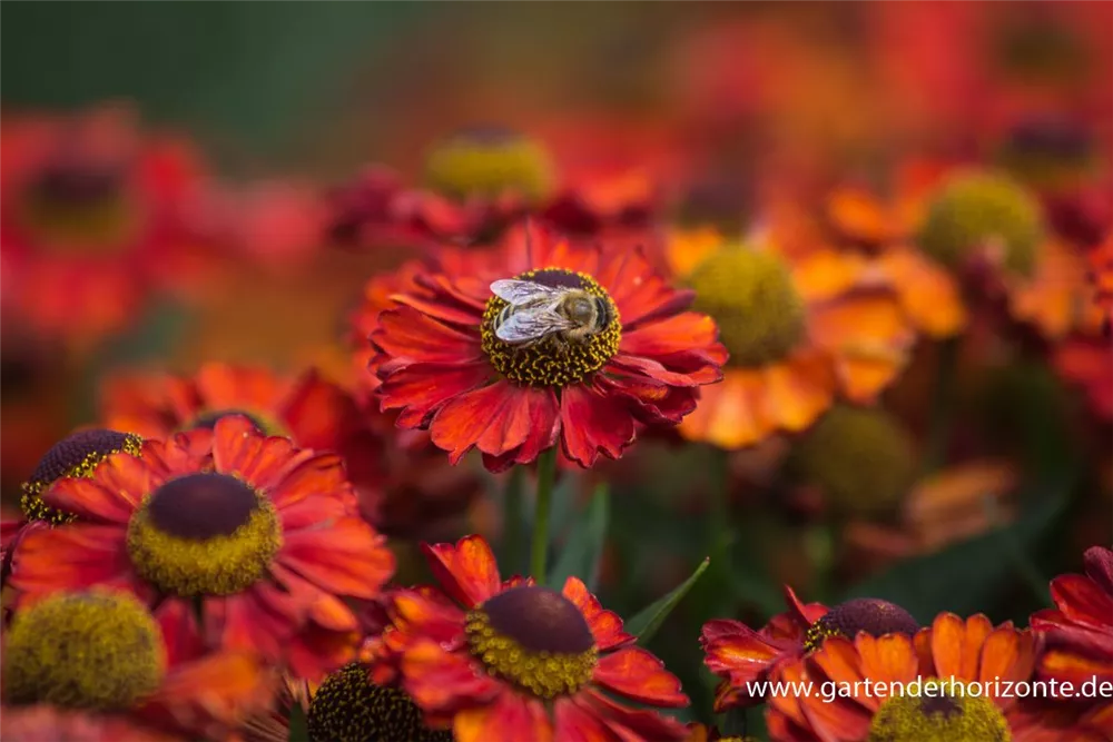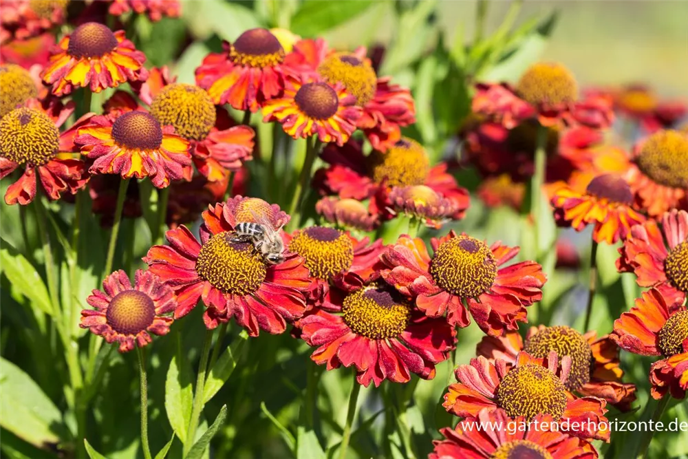 Helenium 'Hot Lava' bildet körbchenartige, rote Blüten ab Juli.