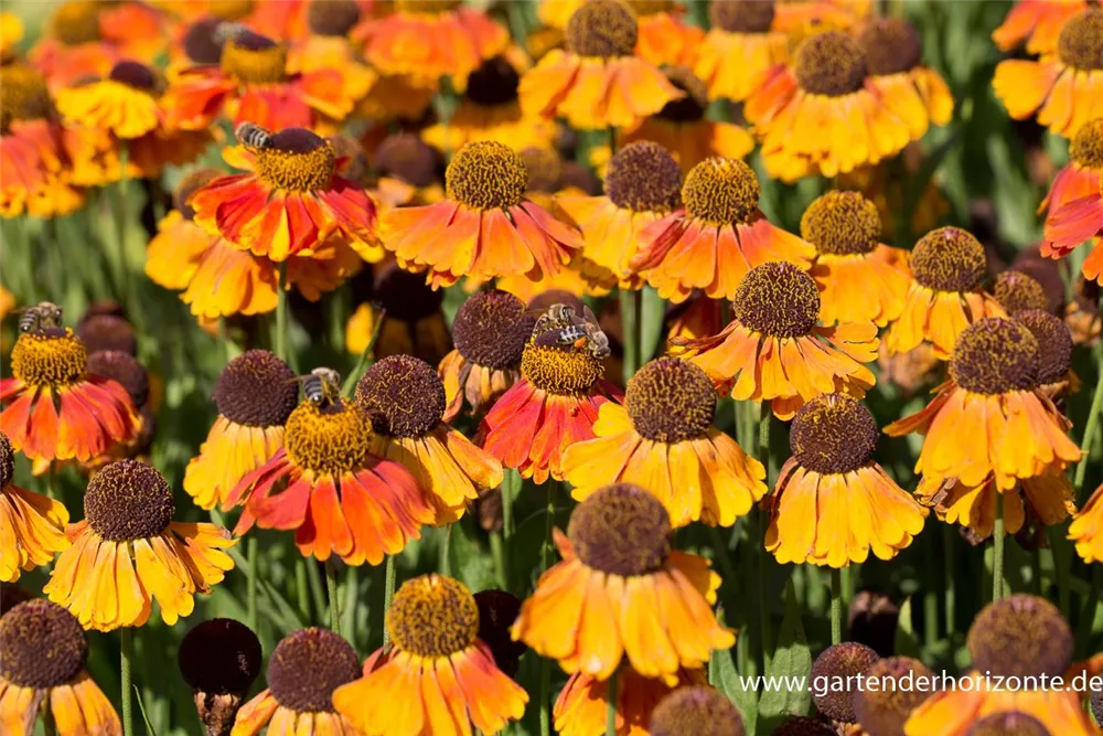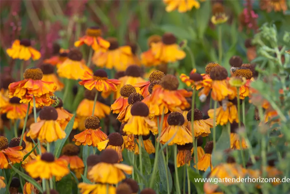 Die Garten Sonnenbraut 'Hartmut Rieger' (Helenium) ist eine aufrechte, lockere Staude, die von Juli bis September goldgelbe, körbchenartige Blüten mit einem angenehmen Duft bildet. An einem sonnigen Standort mit durchlässigem, nährstoffreichem Boden erreicht sie gewöhnlich eine Höhe von ca. 1,2 m und wird ca. 90 cm breit. Die Garten Sonnenbraut 'Hartmut Rieger' ist gut frostverträglich.