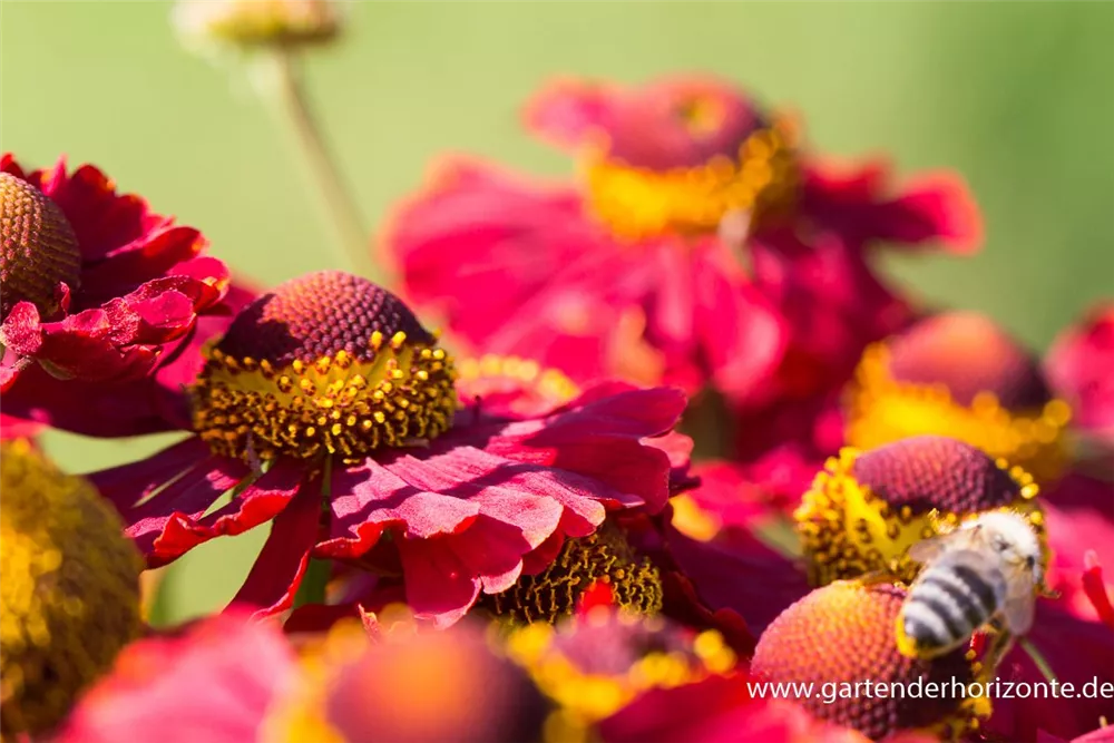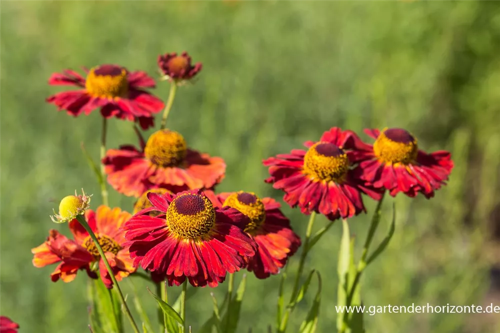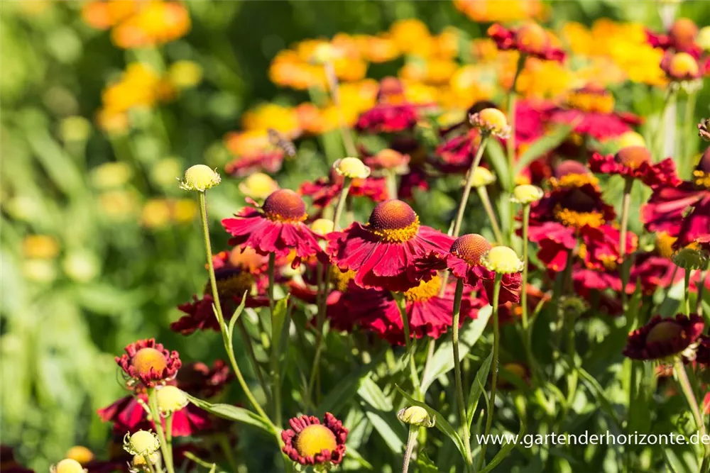Helenium 'Rubinkuppel' bildet körbchenartige, dunkelrote Blüten ab Juli.
