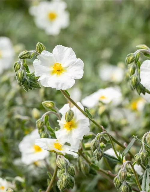 Helianthemum 'Eisbär' bildet schalenförmige, weiße Blüten ab Mai.