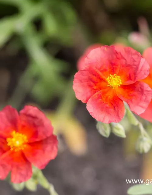 Helianthemum cultorum 'Chocolate Blotch' bildet schalenförmige, orangefarbene Blüten ab Juni.
