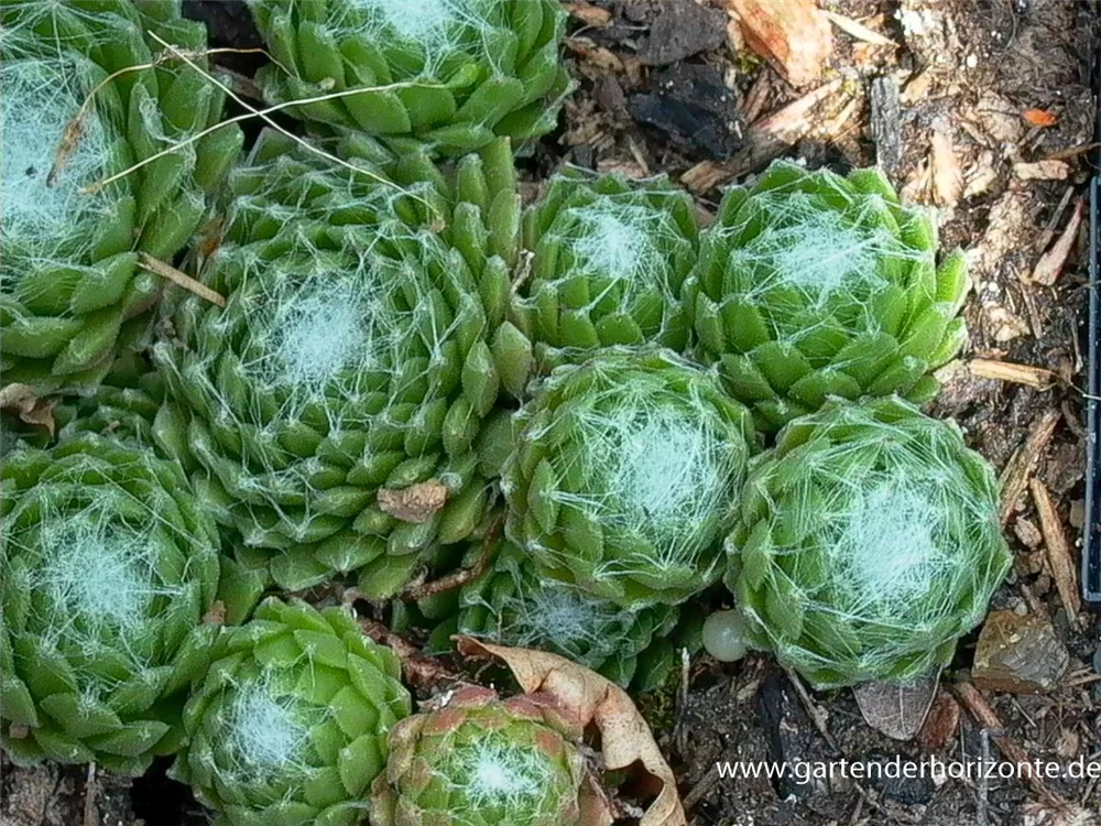 Die Spinnwebige Steinrose (Sempervivum arachnoideum) ist eine polsterbildende, rosettenartige immergrüne Staude, die von Juni bis Juli karminrote Blüten bildet. An einem sonnigen Standort mit lockerem Boden erreicht sie gewöhnlich eine Höhe von ca. 15 cm und wird ca. 20 cm breit. Die Spinnwebige Steinrose ist an geschützten Standorten gut frostverträglich.