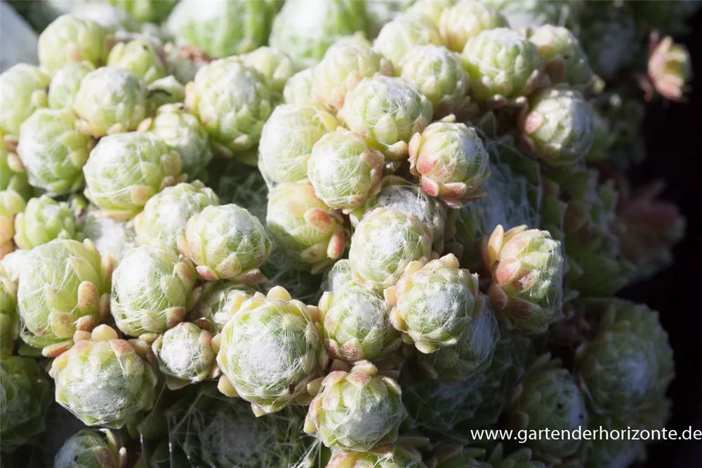 Sempervivum arachnoideum bildet karminrote Blüten ab Juni.