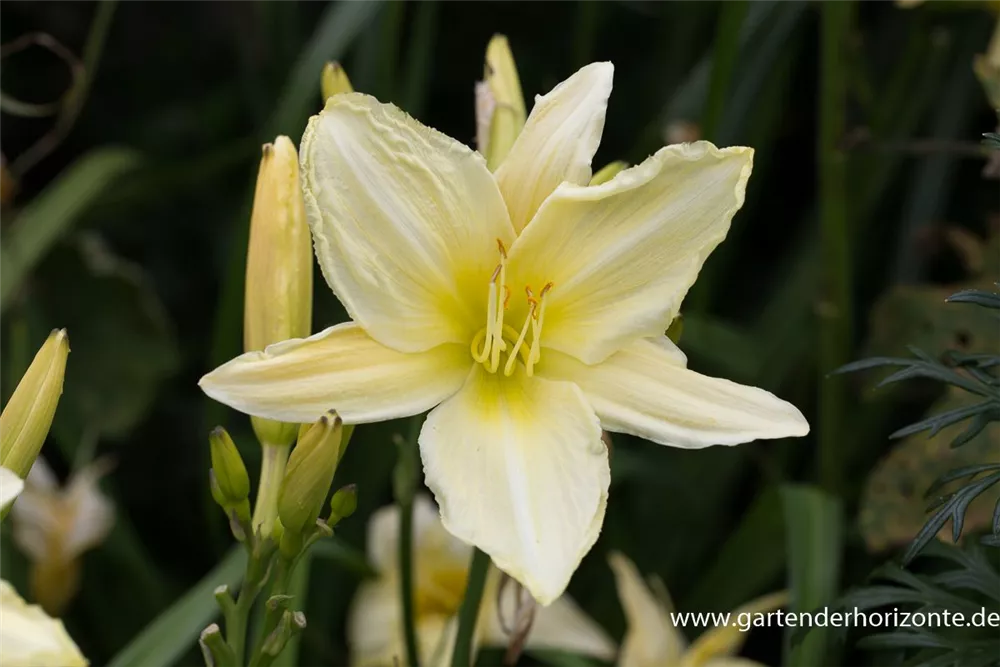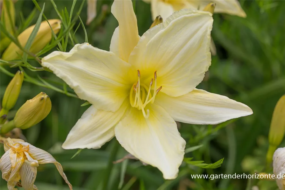 Hemerocallis 'Icecap' bildet trichterförmige, weiße Blüten ab Juli. Diese verströmen einen angenehmen Duft.
