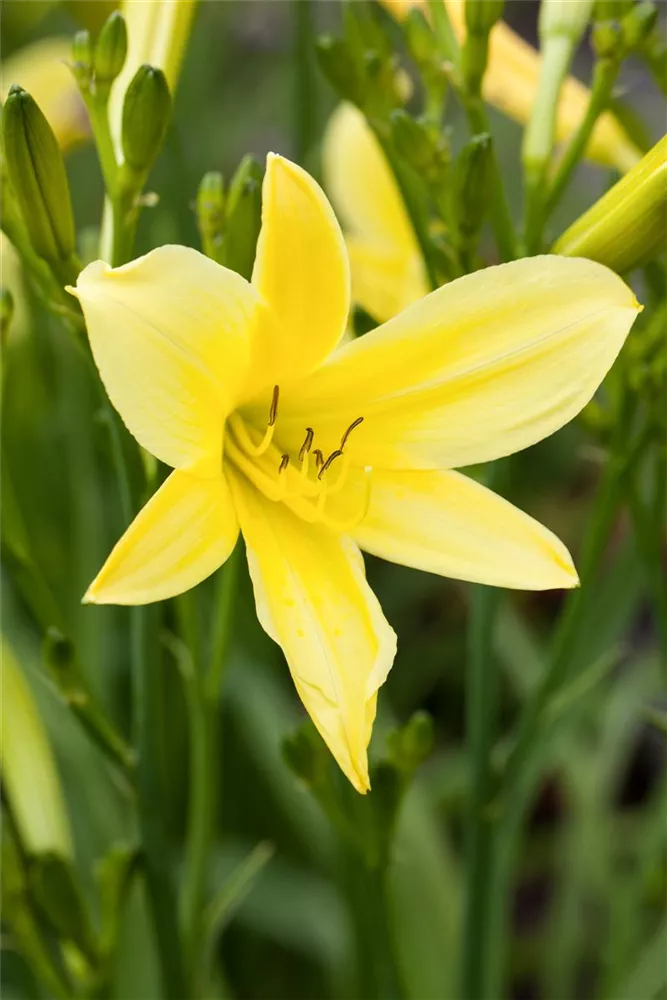 Die Garten-Taglilie 'Canari' (Hemerocallis) ist eine aufrechte Staude, die von Juni bis Juli hellgelbe, trichterförmige Blüten bildet. An einem sonnigen Standort mit durchlässigem, nährstoffreichem Boden erreicht sie gewöhnlich eine Höhe von ca. 90 cm und wird ca. 50 cm breit. Die Garten-Taglilie 'Canari' ist gut frostverträglich.