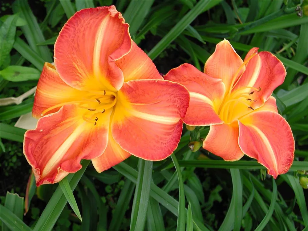 Die Garten-Taglilie 'Shola' (Hemerocallis) ist eine aufrechte Staude, die von Juni bis Juli kupferorange, trichterförmige Blüten bildet. An einem sonnigen Standort mit durchlässigem, nährstoffreichem Boden erreicht sie gewöhnlich eine Höhe von ca. 60 cm und wird ca. 50 cm breit. Die Garten-Taglilie 'Shola' ist gut frostverträglich.
