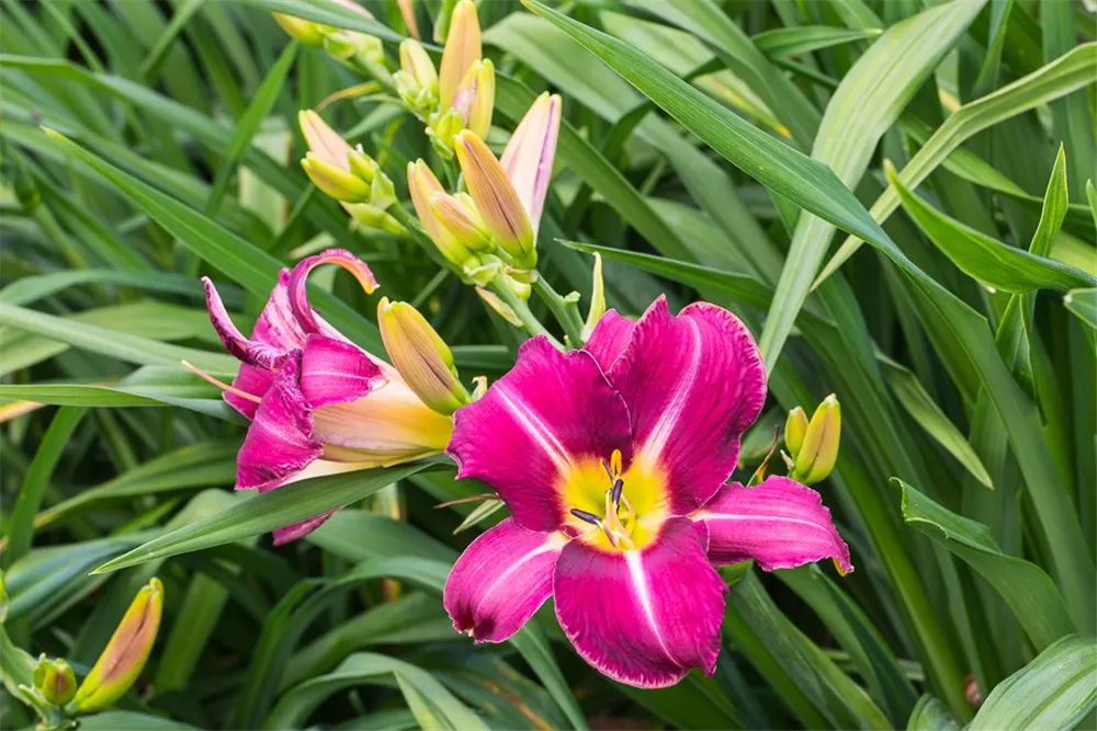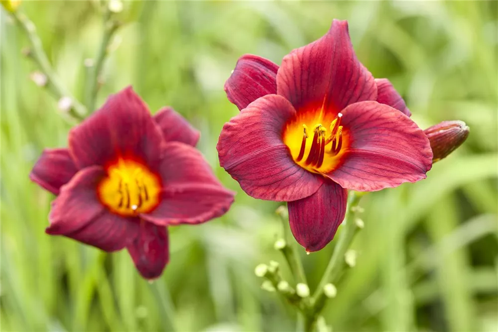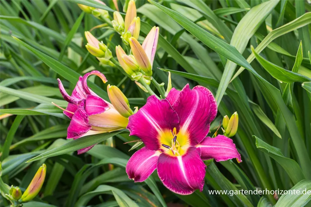 Hemerocallis 'Olive Baily Langdon' bildet trichterförmige, purpurrote Blüten ab Juli.