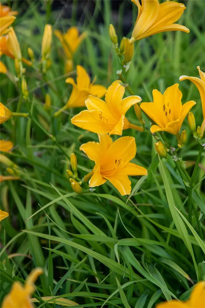 Die Garten-Taglilie 'Thumbelina' (Hemerocallis) ist eine aufrechte Staude, die von Juni bis September orangefarbene, trichterförmige Blüten bildet. An einem sonnigen Standort mit durchlässigem, nährstoffreichem Boden erreicht sie gewöhnlich eine Höhe von ca. 70 cm und wird ca. 50 cm breit. Die Garten-Taglilie 'Thumbelina' ist gut frostverträglich.