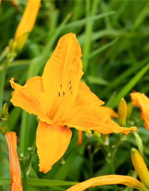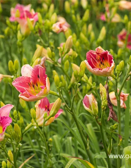 Die Garten-Taglilie 'Always Afternoon' (Hemerocallis) ist eine aufrechte Staude, die, je nach Sorte, trichterförmige Blüten in verschiedenen Farben bildet. An einem sonnigen Standort mit durchlässigem, nährstoffreichem Boden erreicht sie gewöhnlich eine Höhe von ca. 60 cm und wird ca. 70 cm breit. Die Garten-Taglilie 'Always Afternoon' ist gut frostverträglich.