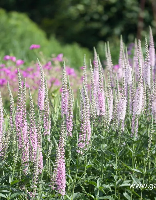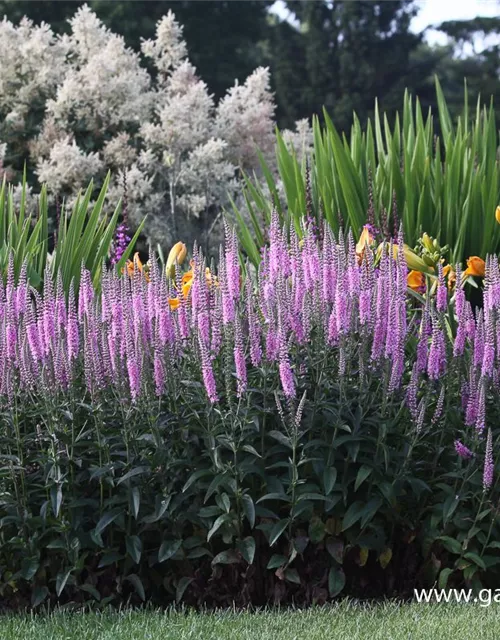 Veronica longifolia 'Pink Damask' bildet rachenförmige, in Trauben angeordnete, rosafarbene Blüten ab Juli.