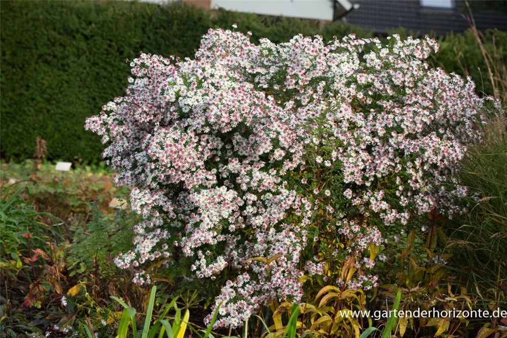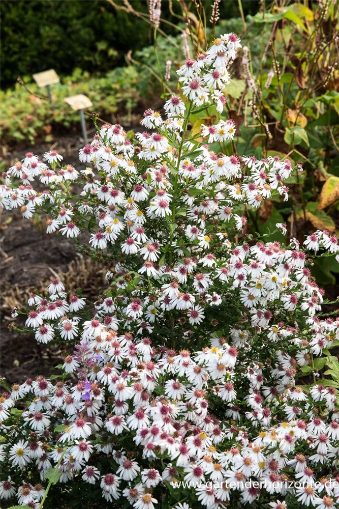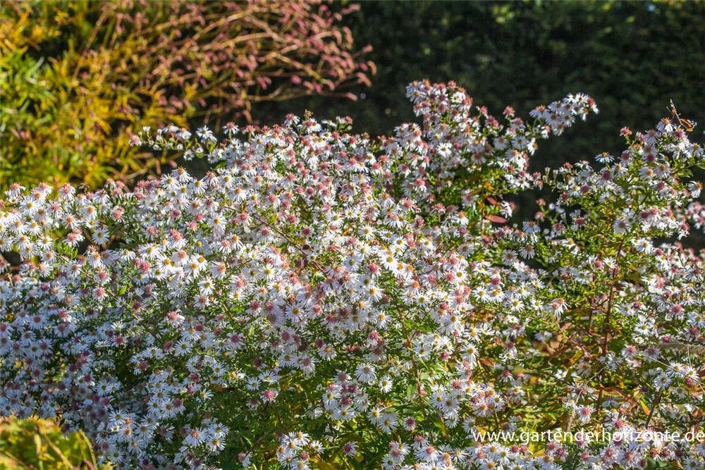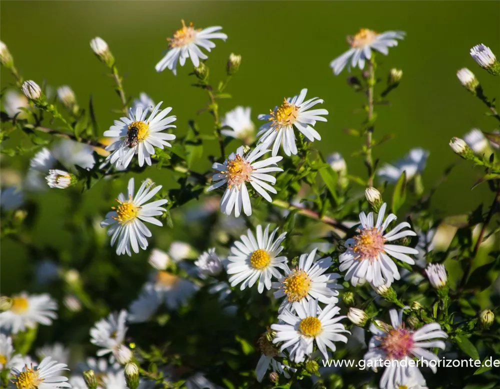 Aster lateriflorus var. horizontalis 'Chloe' bildet körbchenartige, weiße Blüten ab September. Diese verströmen einen angenehmen Duft.