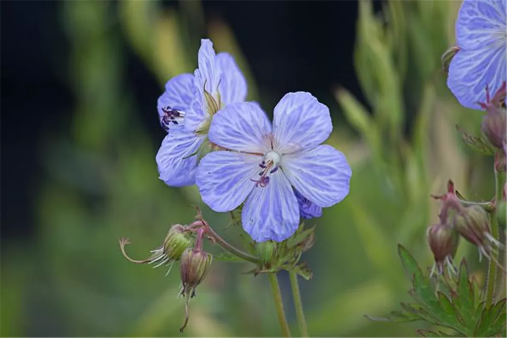 Der Garten-Storchschnabel 'Striatum' (Geranium pratense) ist eine horstbildende, lockere Staude, die von Juni bis August weiß-blaue, schalenförmige Blüten bildet. An einem sonnigen bis halbschattigen Standort erreicht er gewöhnlich eine Höhe von ca. 50 cm und wird ca. 50 cm breit. An den Boden stellt der Garten-Storchschnabel 'Striatum' keine besonderen Ansprüche. Der Garten-Storchschnabel 'Striatum' ist gut frostverträglich.