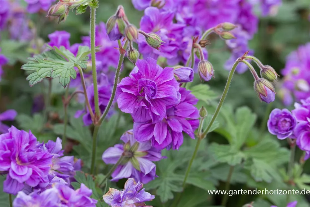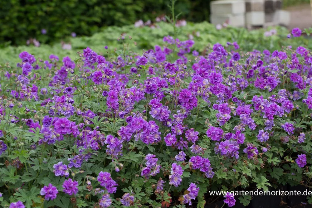 Der Garten-Storchschnabel 'Plenum Violaceum' (Geranium pratense) ist eine horstbildende, lockere Staude, die von Juni bis September violette, schalenförmige Blüten bildet. An einem sonnigen bis halbschattigen Standort erreicht er gewöhnlich eine Höhe von ca. 70 cm und wird ca. 50 cm breit. An den Boden stellt der Garten-Storchschnabel 'Plenum Violaceum' keine besonderen Ansprüche. Der Garten-Storchschnabel 'Plenum Violaceum' ist gut frostverträglich.