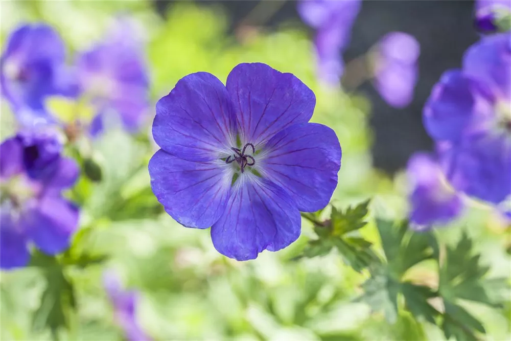 Geranium pratense 'Spinners' bildet schalenförmige, blauviolette Blüten ab Juni.