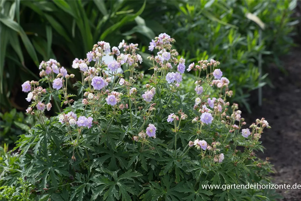 Der Garten-Storchschnabel 'Summer Skies'® (Geranium pratense) ist eine horstbildende, lockere Staude, die von Juni bis August lilafarbene, schalenförmige Blüten bildet. An einem sonnigen bis halbschattigen Standort erreicht er gewöhnlich eine Höhe von ca. 60 cm und wird ca. 40 cm breit. An den Boden stellt der Garten-Storchschnabel 'Summer Skies'® keine besonderen Ansprüche. Der Garten-Storchschnabel 'Summer Skies'® ist gut frostverträglich.