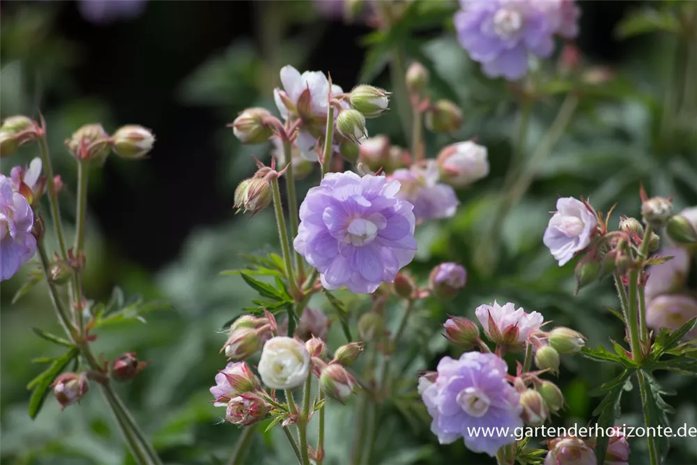 Geranium pratense 'Summer Skies'® bildet gefüllte, schalenförmige, lilafarbene Blüten ab Juni.