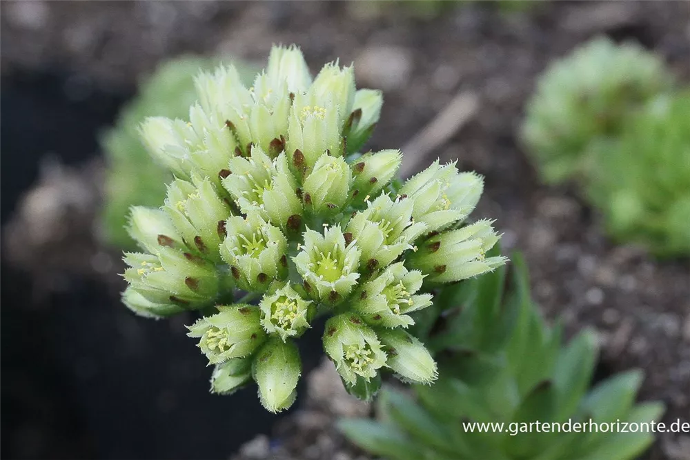 Sempervivum wulfenii bildet in Dolden angeordnete, gelbe Blüten ab Juli.