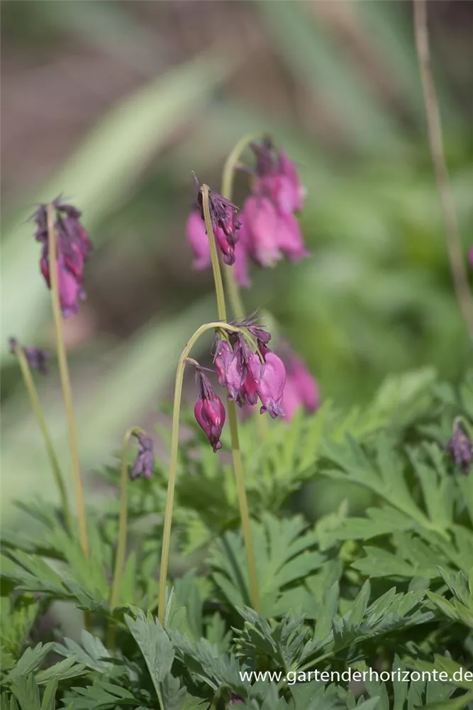 Dicentra eximia bildet in Trauben angeordnete, rosafarbene Blüten ab Mai.