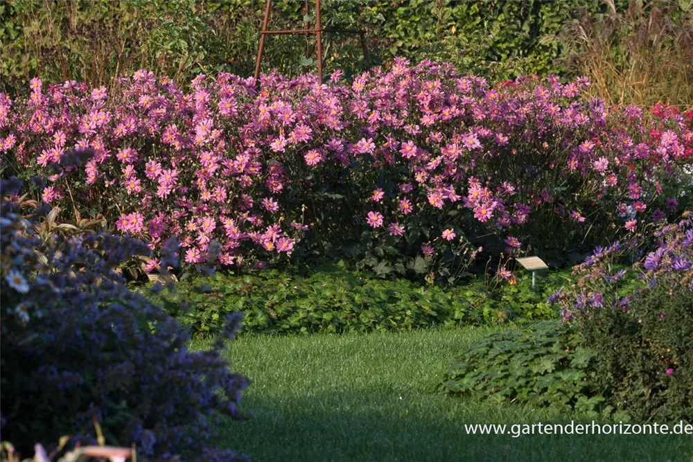 Die rosaroten, schalenförmigen Blüten sind halbgefüllt und erscheinen von August bis September.