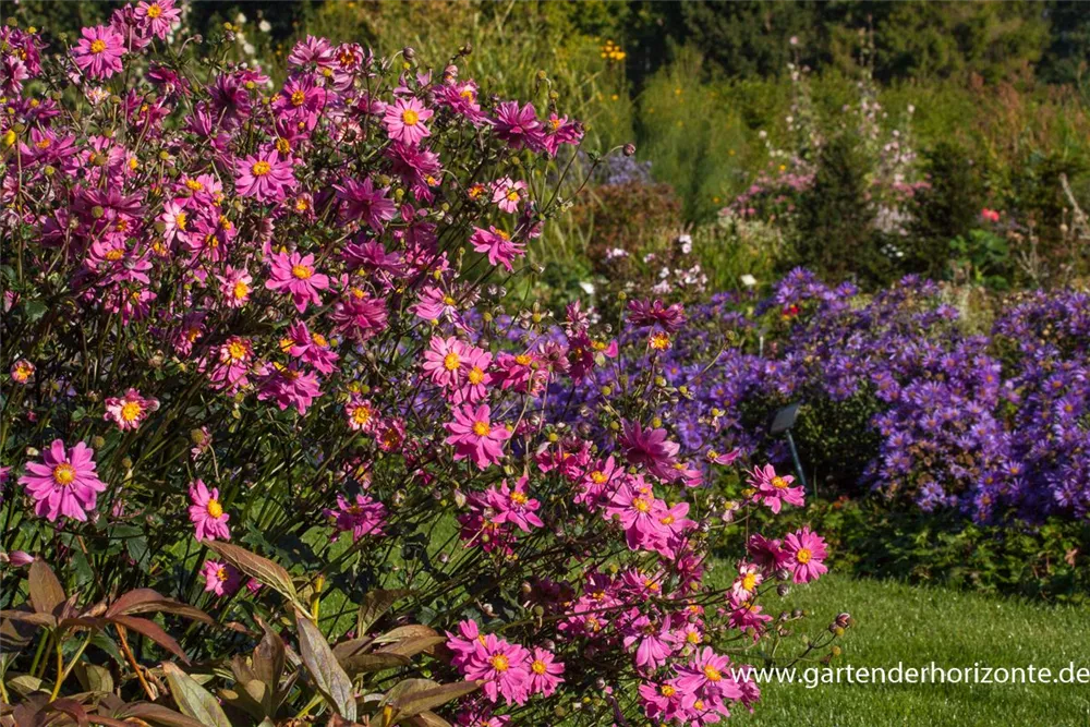 Die Garten-Herbst-Anemone 'Bressingham Glow' (Anemone japonica) bringt ansehnliche, rosarote, halbgefüllte Blüten von August bis September hervor. Bevorzugt wird ein durchlässiger, humoser Boden in sonniger bis halbschattiger Lage. Die aufrechte, ausläuferbildende Staude erreicht gewöhnlich eine Höhe von 40 - 50 cm und wird bis zu 40 cm breit.