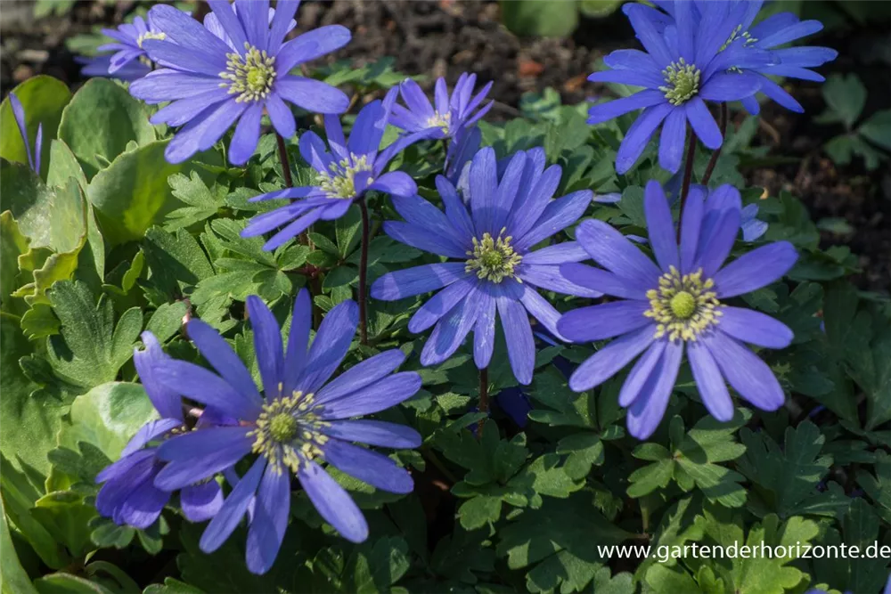 Das Garten-Strahlen-Windröschen 'Blue Shades' (Anemone blanda) bringt ansehnliche, blaue Blüten von März bis Mai hervor. Bevorzugt wird ein durchlässiger, humoser, kalkfreier Boden in sonniger bis halbschattiger Lage. Die rhizombildende, horstbildende Staude erreicht gewöhnlich eine Höhe von 10 - 15 cm und wird bis zu 15 cm breit.