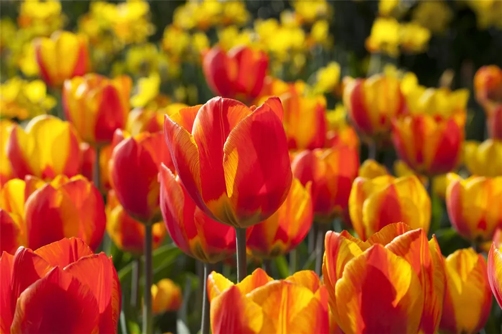 - Die Tulpe 'Flair' bringt Farbe in den Frühling. Die gelb-orange-rot geflammten Blüten versprühen Leichtigkeit und Fröhlichkeit.
