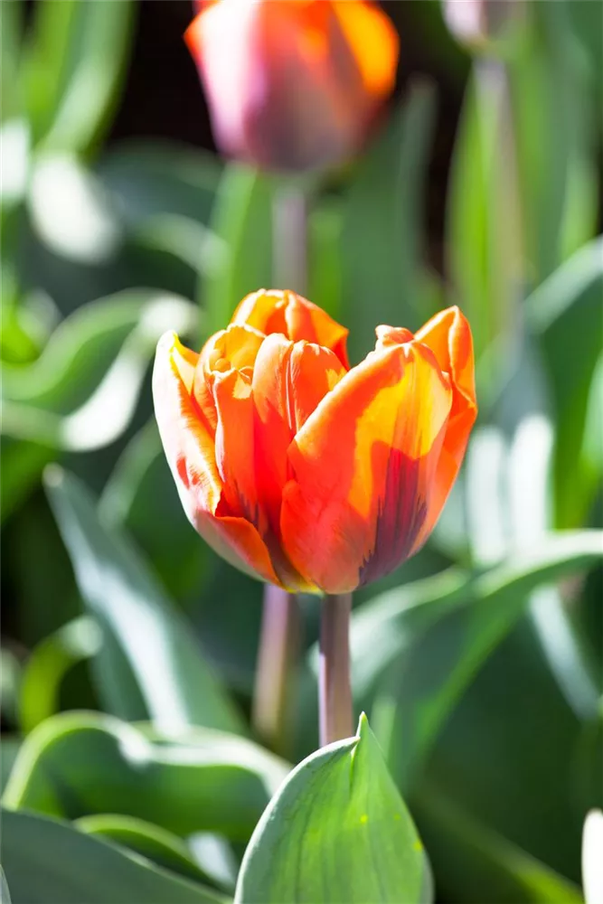 - größe, kelchförmige, feurige mandarine-rote Blüten mit einer violetten Flamme im mittleren