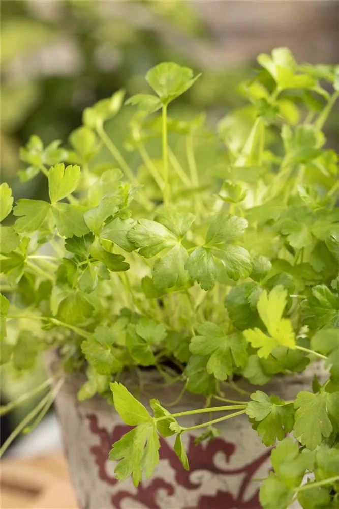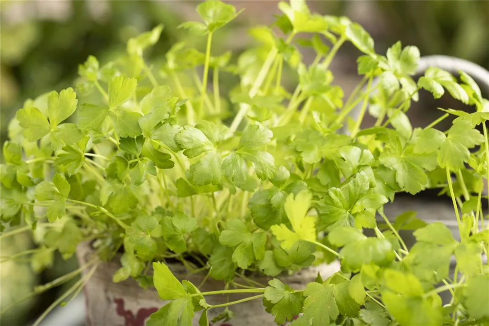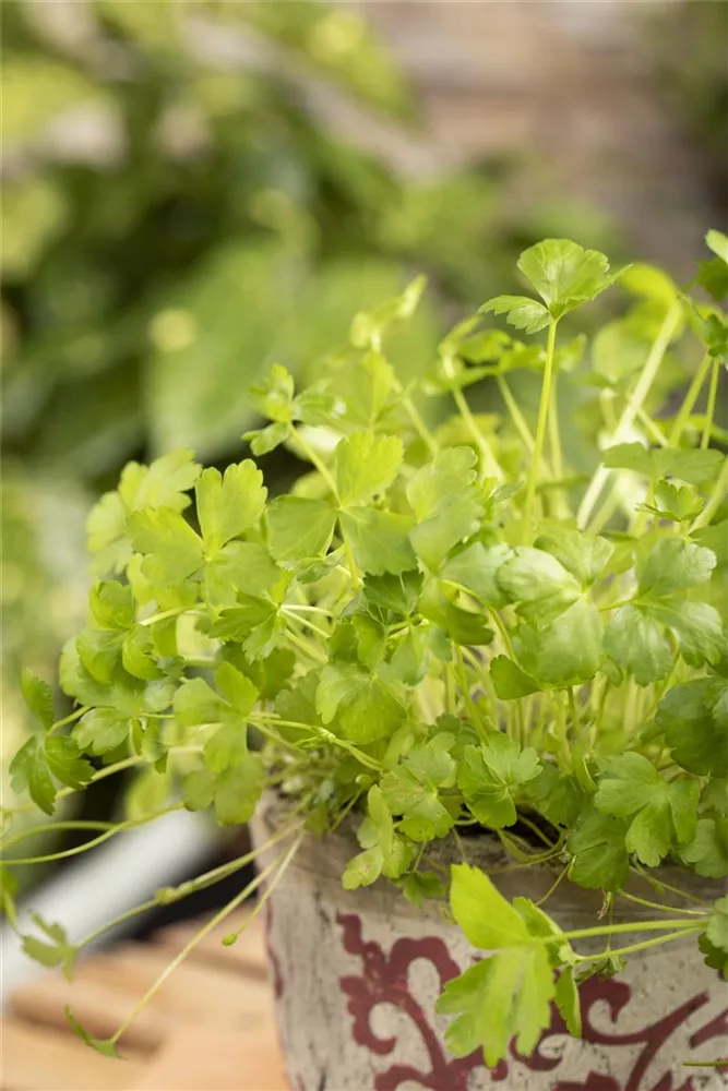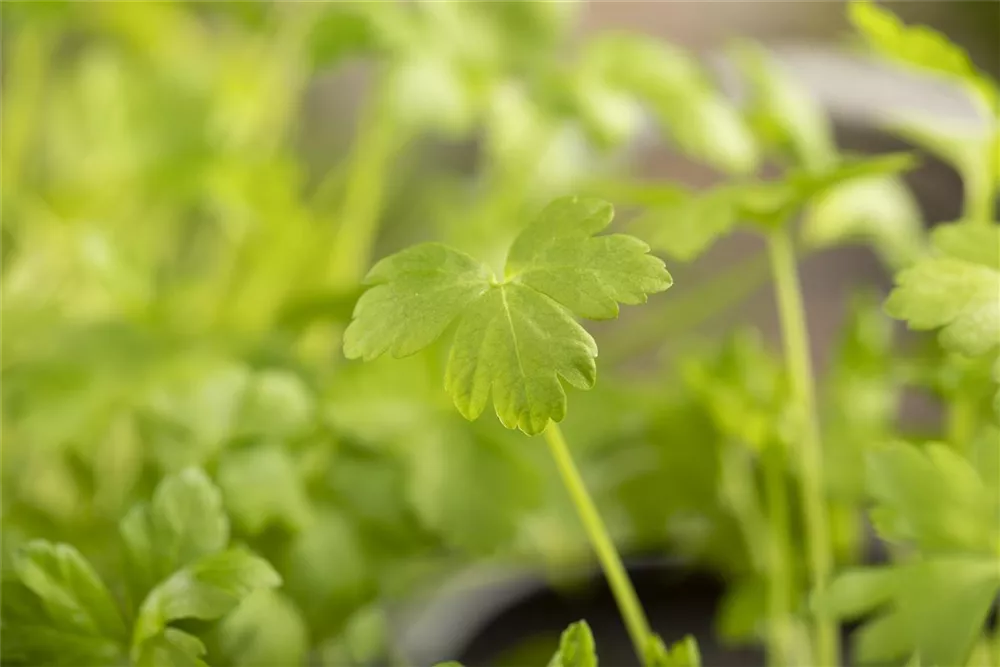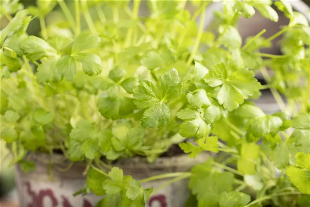 Ein wahres Multitalent wächst mit der Glatten Petersilie im Kräutergarten oder auch auf der Fensterbank. Nicht nur Speisen lassen sich mit der Glatten Petersilie verfeinern, auch der pharmazeutische Nutzen der zweijährigen Pflanze ist beachtlich. Petersilie wird am besten auf einem nährstoffreichen Lehmboden ausgesät. Die Wurzeln können bis 15 cm lang werden und lassen sich ebenfalls als Gewürzmittel verwenden. Gönnen Sie der Glatten Petersilie einen sonnigen Standort und halten die Erde gleichmäßig feucht, dann kann nach wenigen Wochen die Erntezeit beginnen.